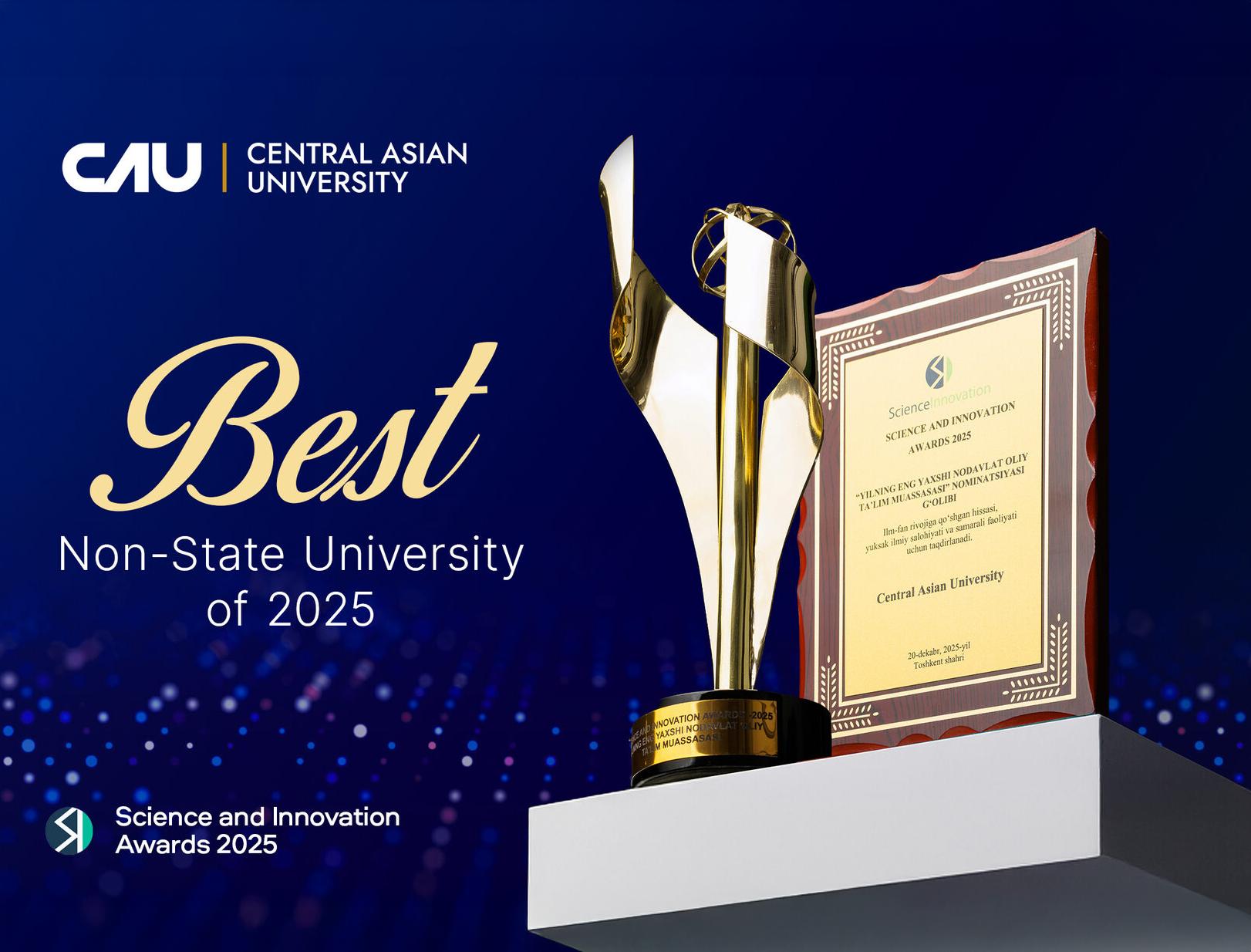 Central Asian University has been honored with the prestigious title “Best Non-State Higher Education Institution of 2025” at the Science and Innovation Awards, in recognition of its significant contribution to the development of science and education.